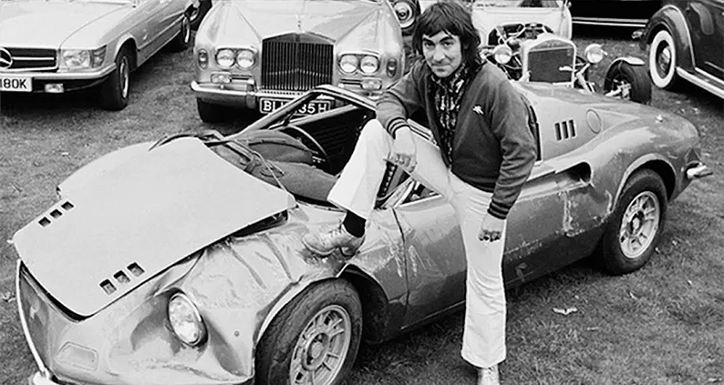 Tout cela reste un peu flou. Par contre, ce qui est arrivé à sa Ferrari Dino 246 est beaucoup plus clair et, curieusement, ce n’est pas lui qui l’a massacrée. Quelques semaines seulement après l’avoir achetée et alors qu’il est dans son pub habituel, le Golden Grove, il rencontre deux motards sympas qui souhaitent essayer le bolide. Généreux et confiant le batteur leur passe les clés. Malheureusement, les gars n’ont pas vu le panneau signalant des travaux et sont partis aux pâquerettes. On ignore ce qu’il est advenu de la Dino de Moon après l’accident, mais le plus probable est que, réduite à l’état d’épave, elle ait été mise à la casse.