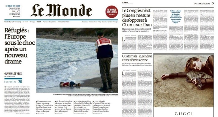 La photo représente le corps échoué et sans vie d’un petit Syrien de 3 ans. Aylan Kurdi gît sur une plage de Turquie. Que le journal Le Monde, comme d’autres, décide d’en faire sa une pour illustrer les affres des problèmes migratoires c’est son choix et le débat déjà lancé reste entier et pourrait se suffire à lui même. Malheureusement, dans ce même quotidien et quelques pages plus loin un autre cliché. Celui d’une jeune femme blonde, pâle, les yeux cernés de noir, étendue elle aussi sur le sable mouillé. Elle est mannequin. Sa tête repose sur un sac. Un sac de luxe. Il s’agit d’une campagne publicitaire pour GUCCI. Mises côte à côte par manque de discernement, les deux photos deviennent tout à coup le symbole absolu de la révulsion, du cynisme, du mauvais goût et de l’obscénité. Elle est là aussi la véritable horreur! Pauvre Monde! Triste monde!