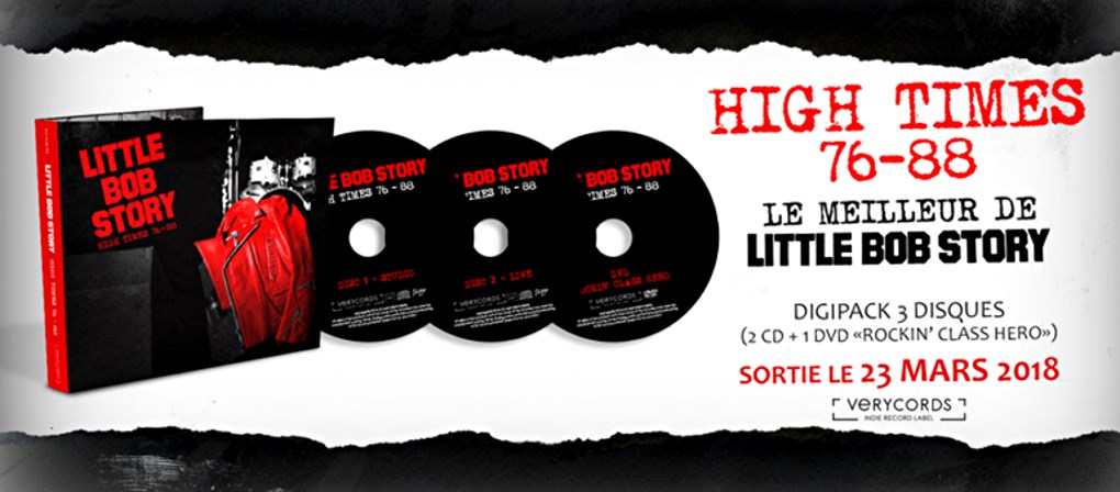 Quoiqu’on en pense et quoi qu’on en dise l’histoire du rock’n’roll made in France ne se limite pas à Jojo Smett, Téléphone ou Trust. Non! le rock’n’roll made in France a aussi une légende: Roberto Piazza, alias Little Bob. Le premier groupe de Ti’ Bob’ le havrais, Little Bob Story, a déboulé sur l’hexagone avec son rock high energy dans les années 70. Entre Pub-Rock et punk Rock, le gang s’est peu à peu taillé une solide réputation, y compris en jouant à de multiples reprises en tête d’affiche en Angleterre. Little Bob a toujours bénéficié d’une grande reconnaissance de ses pairs: Clash, Sex Pistols et autres Jam ne manquaient pas de venir les voir se produire sur scène. Même Lemmy y est allé de sa contribution en prêtant sa voix sur l’introduction de Ringolevio: ″Listen up sons of bitches, Little Bob’s gonna tell you a story!″ [Ecoutez enfoirés, Little Bob va vous raconter une histoire!]. Voici donc un  hommage qui tombe à pic avec cette initiative de la part de Veryrcord qui publie High Time 76-88, une compilation double CD & DVD regroupant 19 titres tirés des 7 albums studios, une démo, un inédit, ainsi que 13 titres live enregistrés entre 1979 et 1988. Sur le DVD, l’excellent documentaire ″Rockin’ Class Hero″ dans lequel Eric Burdon (Animals), Glen Matlock (Sex Pistols), Manu Chao, Serge Teyssot-Gay (Noir Désir) viennent témoigner de leur profonde admiration pour Little Bob. Qu’on se le dise!