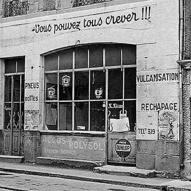 Auray – Vous pouvez tous crever! Publié le 12 juillet 201820 janvier 2025 par blackbonnie64 Dans les années 60, le garage Miran à Auray dans le Morbihan donnait à la fois sur la rue du Penher et la rue du Père-Eternel. Avenue Wilson s’affichait le slogan publicitaire du bouclar: ″ Vous pouvez tous crever. Miran est là pour vous réparer! ″ Évaluez ceci :Partager l'aricle! Cliquez pour partager sur Facebook(ouvre dans une nouvelle fenêtre) Facebook Cliquez pour partager sur Pinterest(ouvre dans une nouvelle fenêtre) Pinterest Cliquez pour partager sur LinkedIn(ouvre dans une nouvelle fenêtre) LinkedIn Cliquez pour partager sur WhatsApp(ouvre dans une nouvelle fenêtre) WhatsApp J’aime chargement… Articles similaires