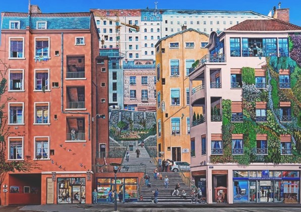 Situé dans le quartier nord de la Croix-Rousse du Vieux Lyon, cette œuvre monumentale fait partie de la vingtaine des murs peints qui colorisent la ville. Réalisée pour la première fois en 1987, cette fresque revisitée en 1997 et 2013, est visible à l’angle de la rue Denfert-Rochereau et du boulevard des Canuts qui doit son nom aux ouvriers de la soie. Une coopérative d’artistes créée en 1978, est à l’origine de cette fresque en trompe-l’œil sur une paroi aveugle d’habitations de 1200 m2 sur laquelle s’organise la vie quotidienne d’authentiques habitants du quartier. Les peintres du collectif CitéCréation ont acquis leur renommée en partie grâce à ce Mur des Canuts qui représente l’une de leurs premières réalisations, et compte parmi les œuvres majeures qui depuis lors ont permis à ces enlumineurs d’acquérir l’occasion d’exprimer leur art un peu partout dans le monde. Passer à Lyon sans rendre visite à L’Horloger de Saint-Paul, Lucie Aubrac ou Gérard Collomb, pourquoi pas; mais parcourir la vieille ville sans faire le mur, impensable!