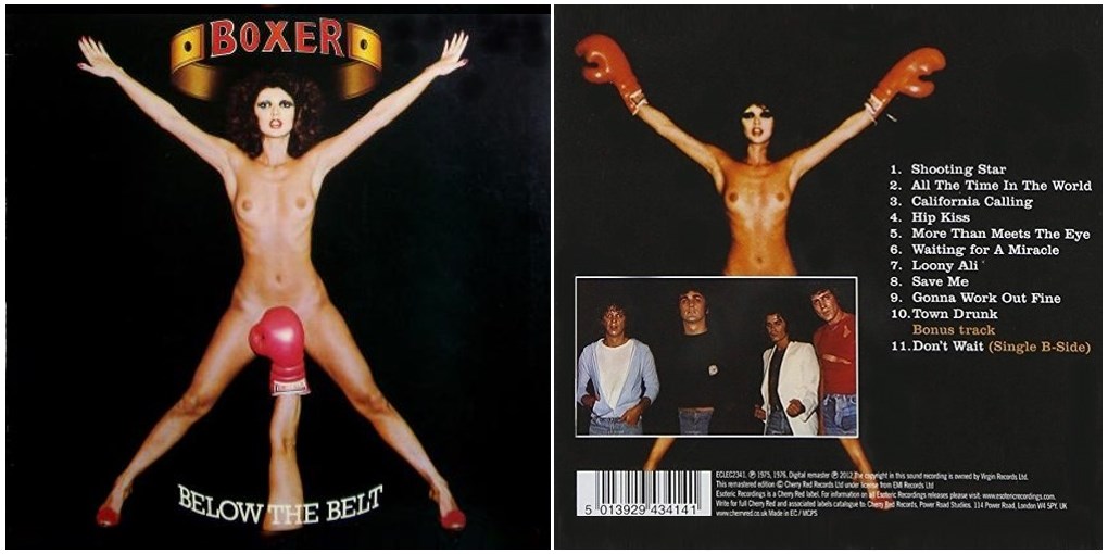 [Extrait]: La première tentative du groupe Boxer, Below the Belt, sort en janvier 1976 chez Virgin. Malgré la présence de Mike Patto (ex Spooky Tooth) au chant et aux claviers, ce premier opus se distingue plus par son Cover Art que par des compostions somme toute assez poussives. A partir d’une photo d’ Alex Henderson, Nigel Thomas élabore le packaging de l’album. Au recto, Stephanie Marrian, une habituée de la page 3 du tabloïd The Sun, pose nue, jambes écartées, avec pour seul accessoire un paire de talons aiguille… rouges… Dans le prolongement d’un bras, un gant de boxe vient opportunément cacher l’entrejambe du top model. Au verso par contre le bras tendu du boxer disparaît, dévoilant sur la même photo la pilosité généreuse de la belle brune qui à l’occasion se voit affublée d’une paire de gants… rouges. Pas moyen de se concentrer sur le tracklisting qui pourtant figure en bonne place! Pour le marché américain, la toison pubienne sera recouverte dans un premier temps par une ceinture de boxeur à l’effigie du groupe, puis, pour les éditions suivantes par une réduction de la photo illustrant l’intérieur du LP. Malgré tout, ne suscitant que peu d’intérêt et de succès, Boxer splittera deux albums plus tard en 1979….