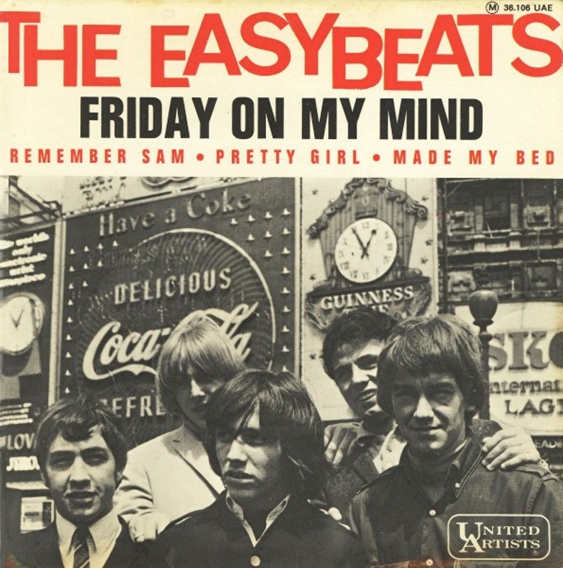 Deux anglais, deux hollandais et un écossais, tous musiciens, se retrouvent à Sidney au milieu des années 60 et forment The Easybeats. Inventif, talentueux et imprégné de rythm and blues, le groupe surfe sur la vague Mod et jouit rapidement sur sa terre d’accueil d’une solide réputation qui, en 1966, lui ouvre la voie d’une distribution discographique internationale. C’est avec leur deuxième single, Friday on my Mind, que les australiens d’adoption vont connaître la gloire, ou presque. Enregistrée à Londres avec le producteur Shel Talmy – alors connu pour avoir bossé avec les Who et les Kinks – la chanson est véritable hymne à la fin de semaine, thème cher à la jeunesse de l’époque qui aspire plus à prendre du bon temps qu’à travailler…
