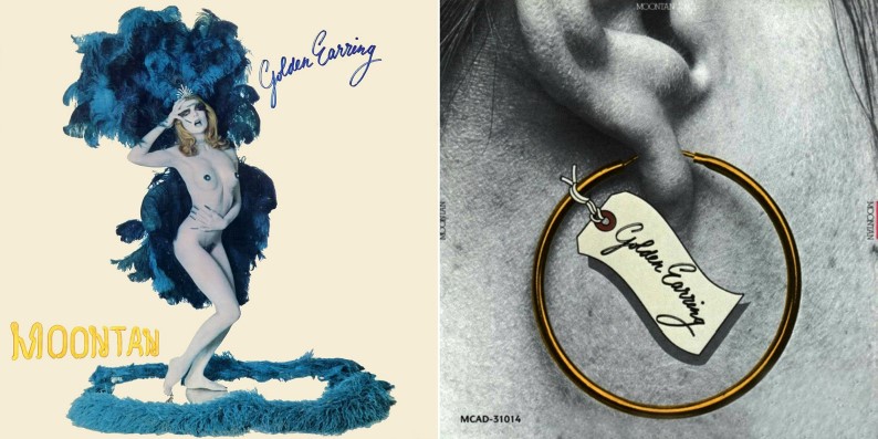 [Extrait]: Formé en 1961 à La Haye, Golden Earring connaît très vite le succès. Entre 1969 et 1984, le groupe effectue de nombreuses tournées en Amérique. Durant cette période ils jouent avec Santana, King Crimson, Led Zeppelin, Kiss, Rush, Aerosmith et Jimi Hendrix. Moontan est leur neuvième album studio. Diffusé par Polydor en 1973, il renferme entre autres titres celui qui deviendra le plus grand succès international des bataves : Radar Love. À partir d’une photo de Ronnie Hertz, c’est une danseuse de cabaret qui tient lieu d’illustration. La Bluebell girl emplumée et lascive pose nue. Aux États-Unis, l’image est rapidement censurée. À sa place c’est désormais un gros plan sur une oreille arborant sur son lobe une créole étiquetée » Golden Earring « .