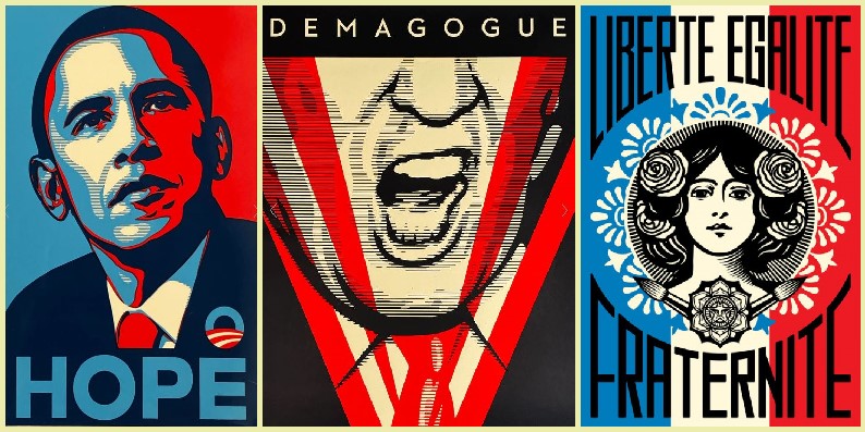 Avec Banksy, l’americain Frank Shepard Fairey figure aujourd’hui dans le top 5 des artistes street art les plus célèbres au monde. Pour lui tout commence en 1989, il a alors 19 ans. À l’époque, ce skateboarder fan de punk rock pratique la sérigraphie sur T-shirts et décore des planches à roulettes. Sa carrière se lance sérieusement quand il recouvre les murs de de sa ville d’autocollants représentant le visage du catcheur français André Roussimoff – aka André Le Géant – sous lequel figure la mention OBEY qui deviendra son pseudo et le nom de son projet de communication au travers duquel il dénonce les travers de la société de consommation et surtout ceux de l’impérialisme américain. De graffs en affiches, de portraits (Sid Vicious, Bob Marley, Tommy Ramone, Blondie etc,.) en pochettes de disques (Led Zeppelin: Motherhip en 2007), la notoriété de Shepard Fairey va grandissante et finit par exploser en 2008 avec son engagement pour la campagne présidentielle de Barack Obama. Plus tard, toujours fidèle aux valeurs militantes, il revient dans l’arène politique avec We The People, une nouvelle campagne qui vise le discours clivant du nouveau président Donald Trump qu’il traite de démagogue. En juin 2016, une fresque monumentale voit le jour à Paris. Elle est visible sur le mur d’un immeuble du XIIIème arrondissement et affiche le soutien au peuple français après les attentats de novembre 2015. Quant au visage de cette Marianne qui orne désormais le mur de l’un des salons de l’Elysée, Obey l’avait créé pour lors d’un projet précédent: Make Art Not War.  ″ Liberté, Egalité, Fraternité ″ est donc un détournement comme l’affirme le street artiste lui même dans une interview. Site officiel de Shepard Fairey: Obey Giant.