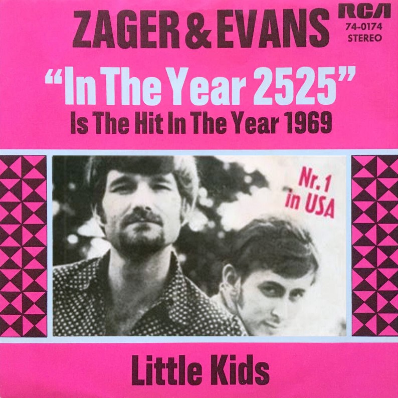 Le single sous-titré Exordium & Terminus évoque élégamment le début et la fin, celle de l’homme une fois que la technologie aura pris le dessus… Succès astronomique pour le duo folk-rock Zager & Evans. Il faut dire que l’époque se prête à merveille aux errances futuristes. Deux longs-métrages de sci-fi paraissent sur les écrans: La Planète des Singes et 2001, L’Odyssée de l’espace. Le 11 juillet, David Bowie raconte l’histoire du Major Tom lors de son Space Odity. Jugé naïvement fantasmagorique et descendu par de nombreux critiques, In the Year 2525 devient pourtant numéro 1 du Billboard Hot 1001 le 12 juillet 1969 et conserve cette place pendant six semaines. La chanson est ainsi en tête des charts anglais et américains lorsque Neil Armstrong pose le pied sur la Lune le 20 juillet. Bien qu’au bas de la liste alphabétique des artistes, Zager & Evans se retrouvent à côtoyer les étoiles avec leur hit écoulé à plus de 10 millions d’exemplaires…