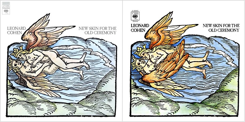 L’une des rares et première fois où Leonard Cohen (1934 – 2016) déroge à la règle, c’est en août 1974 avec New Skin for the Old Ceremony, son cinquième disque. L’estampe utilisée pour l’album représente une gravure tirée du Rosarium Philosophorum, un traité alchimique du XVIème siècle publié en 1550. Sous forme d’allégorie sur l’union des contraires, deux anges couronnés et ailés semblent sur le point s’adonner aux joies de la-bête-à-deux-dos. Activité, on le sait, ô combien bassement terrestre. Puritanisme oblige la gravure sera censurée, notamment aux USA et en Espagne…