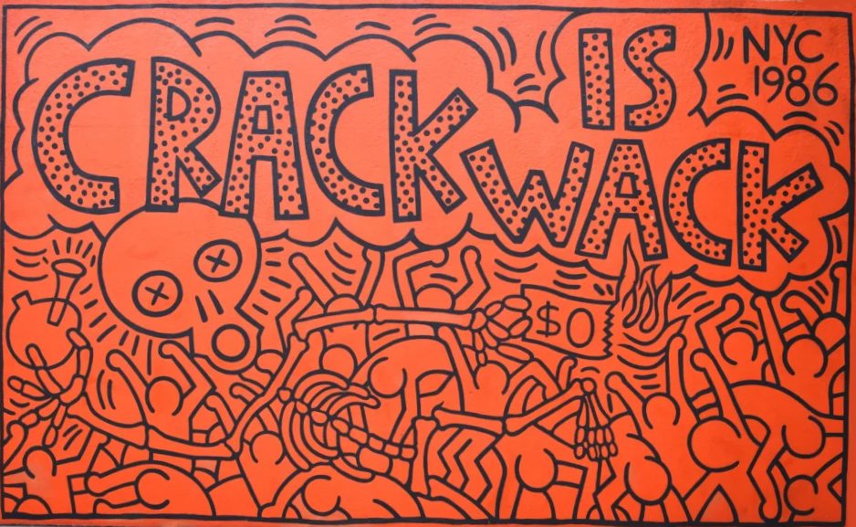 Crack is Wack [Le Crack c’est Nul] est un puissant exemple de l’engagement de l’artiste. Située dans un parc public de New York, la fresque a été peinte en 1986 pour créer un choc face à l’épidémie de crack qui ravageait la ville dans les années 80.