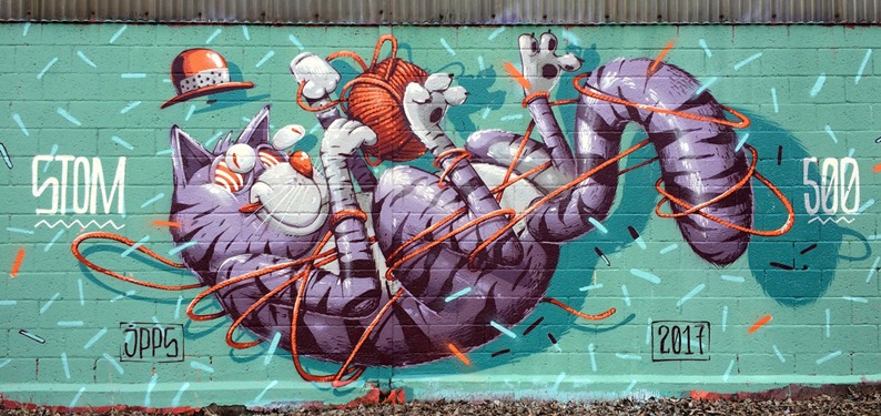 Dès qu’il a su tenir un crayon, le petit Thomas n’avait déjà qu’une idée en tête : dessiner et devenir artiste. Le garçon a grandi et son rêve est devenu réalité. Autodidacte, il a développé ses talents de graffeur sous le nom de Stom 500, pseudo dérivé de son prénom et des 500 milligrammes d’aspirine que doit prendre cet artiste migraineux pour maintenir le rythme imposé par ses projets. Il peint avec beaucoup d’imagination de larges fresques murales avec une prédilection pour les thèmes animaliers nourris par l’énergie euphorique des cartoons. Bombes, acryliques, le street artiste entretient un univers délirant avec des abeilles, des oiseaux, des poissons et d’autres quadrupèdes délirants parmi lesquels les chats occupent une place privilégiée. C’est ainsi qu’en 2017 ce Crazy Cat en mode Tex Avery a élu domicile sur un mur du quartier Port du Rhin à Strasbourg.