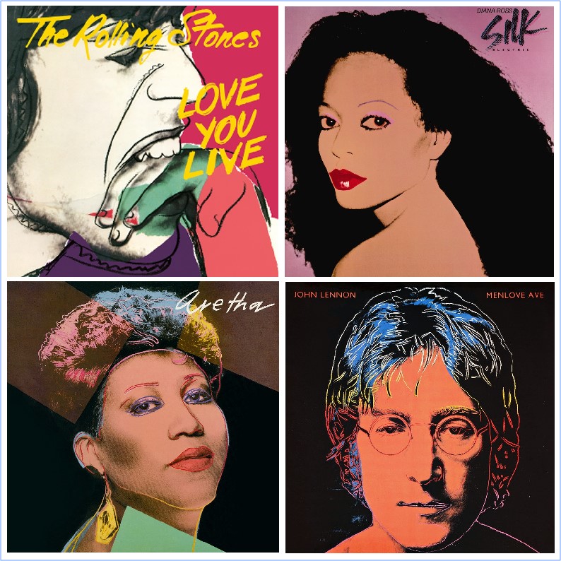 Figure de proue du mouvement Pop Art, c’est à partir de cette époque que Warhol atteint l’apogée de sa notoriété. Ses œuvres explorent la relation entre l’expression artistique et le culte de la célébrité. Il est désormais associé à un style immédiatement reconnaissable, dérivé de ses portraits sur lesquels il applique une technique qu’il utilisera pour ses œuvres les plus célèbres. Les artistes sont photographiés de près et en noir et blanc. Warhol redessine ou repeint sur des aplats en couleur certaines de leurs caractéristiques physiques et leurs traits sont réduits à l’essentiel. Le transfert sérigraphié sur toile met en valeur les yeux, les cheveux ou la bouche. Il suffit de s’arrêter un instant sur les pochettes des albums Love You Live des Stones (1977), Silk Electric de Diana Ross (1982), Aretha d’Aretha Franklin (1986) ou Menlove Ave de John Lennon (1986), pour comprendre le procédé qui consiste à offrir aux stars le statut d’icones.
