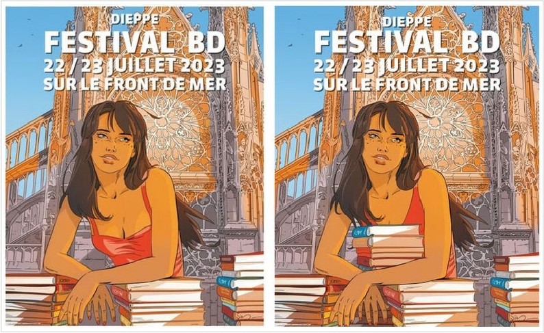 Une robe à peine décolletée a fait réagir la municipalité de gauche de Dieppe qui a fait rajouter des livres sur ce dessin de Jim, l’invité d’honneur du festival de la bande dessinée et auteur de Une Nuit à Rome qui met en scène en scène Marie et Raphaël, amants de 20 ans qui se promettent de se revoir à Rome pour leurs 40 ans. C’est donc tout naturellement que l’héroïne figure sur l’affiche destinée à promouvoir l’événement culturel. Voici donc Marie, accoudée sur des piles de livres avec en arrière plan l’église Saint-Jacques. Au prétexte que s’agissant d’annoncer un événement qui touche tous les publics, la mairie communiste a pensé que ″ la représentation d’une jeune femme en pose lascive, avec un décolleté même discret, n’entrait pas dans la vision qu’elle se fait de la lutte contre les discriminations « . Sans consulter ni faire appel aux services de l’artiste le visuel a donc été modifié. Le décolleté de Marie s’est ainsi retrouvé masqué par un empilement de bouquins, ses cheveux ont pris de la longueur et les fines bretelles de sa robe ont gagné en épaisseur.