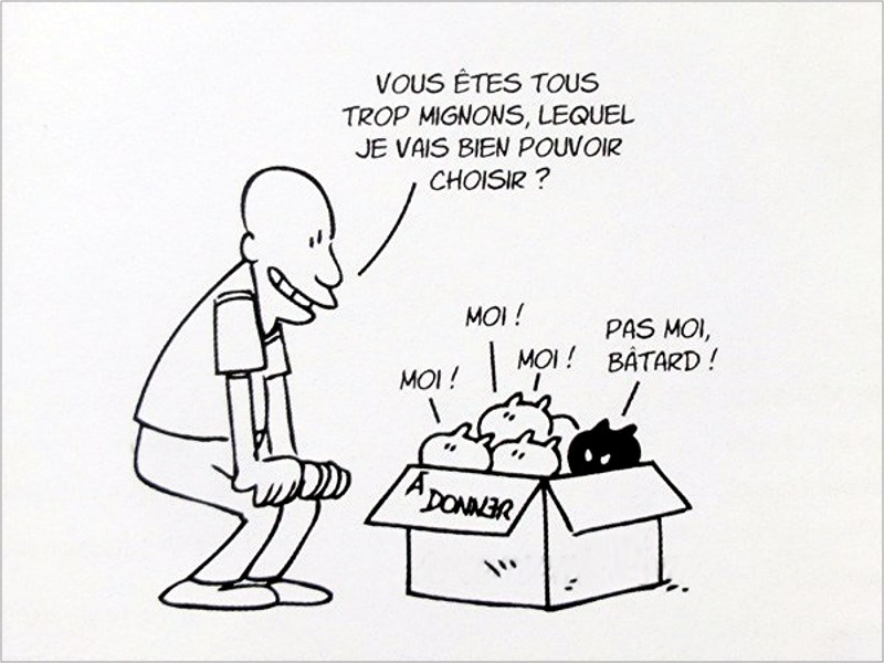 [Lapuss’, auteur de bandes dessinées]: ″ Merci à tous ces cons de chats qui ont croisé ma route depuis toujours, de m’avoir gratifié de leur dédain et de leur indifférence et à plusieurs occasions, de ce qui ressemblait à s’y méprendre à de l’amour ″. Putain de Chat