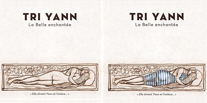 [Extrait]: Pour l’illustrer le 22ème album de Tri Yann sorti le 15 avril 2016 , le graphiste Tanguy Jossic choisit un dessin du peintre sculpteur français Georges Lacombe. Un couple allongé, enlacé et nu, illustre la pochette. Madame est de dos. Une croupe féminine au su et au vu de tous ? Inconcevable ! La représentation de seins, de fesses et de sexes est un motif de blocage sur les sites de streaming. C’est ainsi que se justifie la société française Believe, l’un des leaders mondiaux de la distribution digitale. Contraint de revoir sa copie, Tri Yann doit rhabiller La Belle Enchantée qui » étreint Yann et l’enlace « , mais désormais en costume de bain des années 1900! » Nous n’en voulons pas à Believe – confie l’un des chanteurs, Jean Chocun – elle ne fait que se plier aux normes en vigueur sur le Net, imposées par des firmes comme Apple. L’on peut quand même s’interroger sur l’américanisation de l’Europe et du monde. Quelle pudibonderie stupide ! « . La version physique de l’album reste commercialisée avec sa pochette d’origine sur le label du groupe : Marzelle.