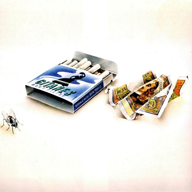 Ce n’est pas la première fois que la marque de cibiches produites par la Seita se retrouve à l’honneur sur des pochettes de disques. Déjà en 1975, pour la galette flamenco-rock de Dancing on a Cold Wind de Carmen, couleurs, motif et lettrage sont trop évidents pour n’être qu’une coïncidence ; le design Gitanes est plagié sans filtre. Shades, le sixième album de J.J. Cale paru en 1980, se contente de remplacer le dessin de l’affichiste Max Ponty par la silhouette d’un guitariste hispanique. Dans tous les cas, aucune réclamation de la part de la régie française des tabacs quant à l’utilisation de son visuel, certes bien moins célèbre dans le monde que ceux de Marlboro ou Lucky Strike. Il n’en reste pas moins que, gros fumeur, Gainsbourg apparaissait toujours en public avec son paquet de brunes à la main et que le ″ Thin White Duke ″ de David Bowie fumait également des Gitanes. Tout comme Slash, le guitariste de Guns N’ Roses, qui est allé jusqu’à se faire tatouer la danseuse au tambourin dans le dos. T’as du feu steuplé?