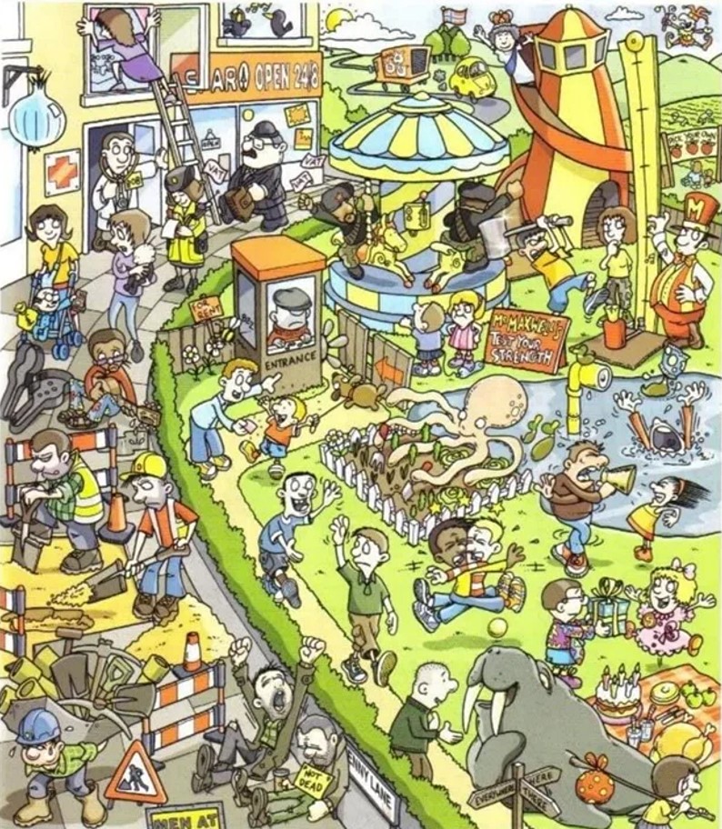 Seul un vrai fan saura trouver les chansons qui se cachent dans cette scène! Au premier coup d’œil l’évocation de certains titres des Fab Four est vraiment évidente. Dans d’autres cas les allusions sont plus subtiles. Parfois aussi la corrélation entre image et mélodie est un peu tirée par les cheveux. Je vous l’accorde. Enfin, une même image peut faire penser à plusieurs titres et il a bien fallu faire un choix. Il n’empêche que, libre d’interprétation, l’exercice reste intéressant et fun, avec ou sans prise de tête.