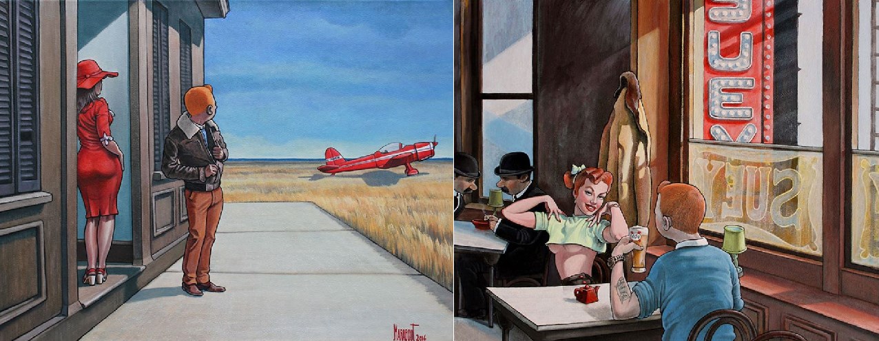 Né en 1967, Xavier Marabout dévoile très tôt il un vrai talent pour le dessin et la peinture. Il réalise sa première exposition d’aquarelles en 1984. Pourtant en 1990, après des études scientifiques, il devient ingénieur commercial pour un laboratoire médical, sans pour autant cesser de peindre et d’organiser des expositions privées. En 2006, changement de cap. Il s’inscrit à la Maison des Artistes. À partir de ce jour, il ne fera plus que peindre. Son travail consiste à dépouiller des univers artistiques éloignés pour les fusionner. Ainsi, en empruntant à la bande dessinée de son enfance et à la peinture des grands maîtres qui le fascinent, cet artiste breton a développé un style où le trait et la parodie sont omniprésents. Dans sa série Tex Avery – Picasso, il organise ainsi la rencontre du célèbre loup libidineux avec des femmes peintes par l’artiste espagnol. Dans une autre parodie de 25 tableaux, Xavier Marabout utilise le regard voyeuriste et attentiste du peintre américain Edward Hopper pour imaginer une vie sentimentale et tumultueuse à un Tintin en compagnie de pin-up. C’est, inattendu, facétieux et très maitrisé. Un régal, malheureusement pas pour tout le monde. Moulinsart, la société qui gère les droits d’Hergé ne goûte guère les œuvres de Xavier Marabout et porte plainte pour contrefaçon et atteinte au droit moral. Jugement le 10 mai prochain.