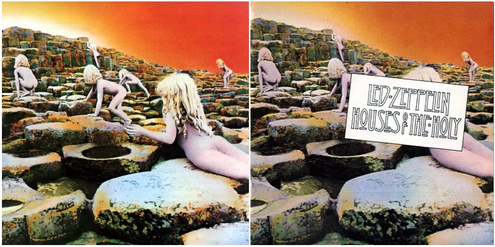 [Extrait]: Le 28 mars 1973, deux ans après Led Zeppelin IV, l’équipage du dirigeable sort Houses of the Holy. Ce cinquième album est aussi le premier à posséder un titre, visible seulement sur la partie interne de la pochette pour laquelle Page et sa bande font appel à Storm Thorgerson. Après un premier projet rejeté, Hipgnosis met en œuvre un concept basé sur un roman de Science Fiction d’Arthur C. Clarke: Childhood’s End (Les Enfants d’Icare)… Aubrey Powell, photographe de l’agence, se rend en Irlande sur la célèbre Giant’s Causeway (la Chaussée des Géants) et réalise plusieurs clichés d’enfants préalablement sélectionnés sur casting. Les photos de Stephan et Samantha Gates sont réalisées en noir et blanc pour être imprimées et faire l’objet de collages. Un problème de teinte au moment de la post production se traduit par un résultat inattendu et saisissant qui, artistiquement parlant, fait l’unanimité chez Led Zeppelin. A contrario et dès les premiers jours le design s’attire les foudres de la bien-pensance, plus particulièrement dans certains états du sud des États Unis. Histoire de calmer les ardeurs des réfractaires, la maison de disques Atlantic édite le disque doté d’un sticker masquant les fesses des gosses qui figurent au premier plan. En 2003 le packaging de l’album sera classé à la 6ème place des 50 plus belles pochettes.