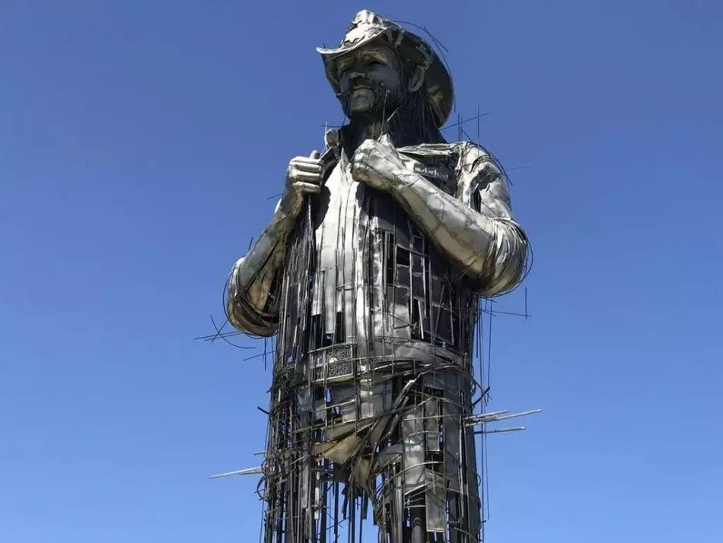 Abîmée par les intempéries et par les visiteurs, l’ancienne statue de Lemmy Kilmister, érigée en 2016 – près de la Warzone du Hellfest – a laissé place à une nouvelle œuvre en acier de 12 mètres de haut, pensée et façonnée par la sculptrice contemporaine Caroline Brisset. Avec cette nouvelle représentation, l’emblématique bassiste se retrouve délesté de sa 4 cordes mais il offre aux fans l’occasion d’un hommage à la hauteur de la déférence qu’ils lui témoignent. Peu après le décès du leader de Motorhead, son manager Todd Singerman avait fait parvenir à Ben Barbaud une partie des cendres de Lemmy. Cette urne était jusqu’à présent conservée sur une étagère dans le bureau du patron du Hellfest. Désormais, elle a sa place dans la nouvelle statue, derrière une vitre blindée.