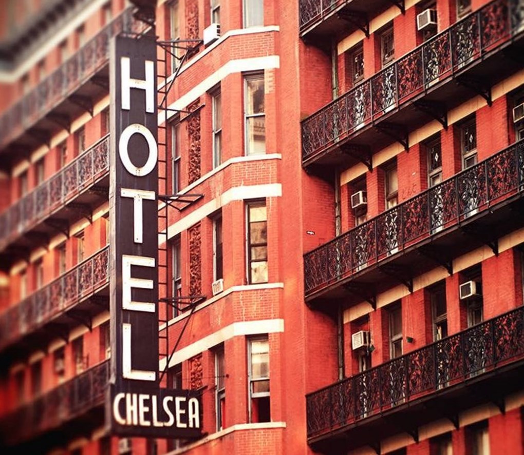 Construit en 1883, l’immeuble de douze étages situé dans le quartier de Chelsea à Manhattan devient un hôtel en 1905. Imposant édifice de briques rouge le Chelsea Hotel devient très rapidement le centre névralgique de la vie artistique new-yorkaise. En mauvais état, l’établissement n’a pas acquis sa notoriété grâce à ses chambres poussiéreuses, son mobilier dépareillé, ni même son service. Lieu de vie bohème, ce sont les artistes qui, lors de leurs passages dans la Big Apple, écrivent son histoire et bâtissent sa réputation en séjournant dans l’une ou l’autre des 400 chambres du 222 West de la 23ème rue. Certains l’ont même évoqué en chanson: Chelsea Morning de Joni Mitchell, Chelsea Girl pour Lou Reed et Third Week in the Chelsea par Jefferson Airplane. Milos Forman, Bob Dylan, Mark Twain, Arthur Miller, Andy Warhol, Jean-Paul Sartre, Simone de Beauvoir ou encore Patti Smith, Tom Waits, Jimi Hendrix, Joan Baez et d’autres y ont effectué des séjours plus ou moins longs. En 1978, Nancy Spungen, la compagne de Sid Vicious, y sera même assassinée à coups de couteau dans la baignoire de la chambre 100.
