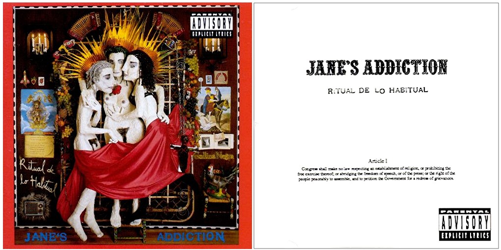 [Extrait]: En 1990 sort le troisième album des Angelinos de Jane’s Addiction. Dès sa parution la nudité affichée sur la jaquette du disque pose problème au sein du parti conservateur US et les membres du groupe se retrouvent poursuivis par la justice au motif de diffusion d’images pornographiques. L’affaire est vite classée sans suite mais le mal est fait et de nombreux revendeurs refusent de mettre l’objet du soi-disant délit dans les bacs. Sollicité par son label Warner, Le chanteur du groupe, Perry Farrel, propose un version alternative du packaging pour remplacer le diorama qu’il avait lui même mis en œuvre pour la première édition. Désormais c’est le Premier Amendement de la Constitution Américaine qui tient lieu de cover art..